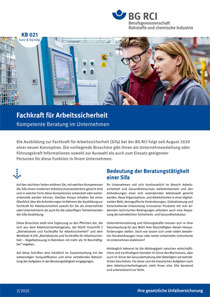 Die Ausbildung zur Fachkraft für Arbeitssicherheit (Sifa) bei der BG RCI folgt seit August 2020 einer neuen Konzeption. Die vorliegende Broschüre gibt der Unternehmensleitung oder Führungskraft Informationen sowohl zur Auswahl als auch zum Einsatz geeigneter Personen für diese Funktion im Unternehmen. Sie fasst die wichtigsten Informationen zusammen.