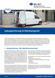 Einen kompakten Überblick über die Aufgaben, die Organisation und die Leistungen der BG RCI bietet das A 007-1. Thematisiert wird im KB 021 die Ausbildung zur Fachkraft für Arbeitssicherheit. KB 029-1 und -2 befassen sich mit einem Dauerbrenner: der Ladungssicherung auf Lkw und Kleintransporter.